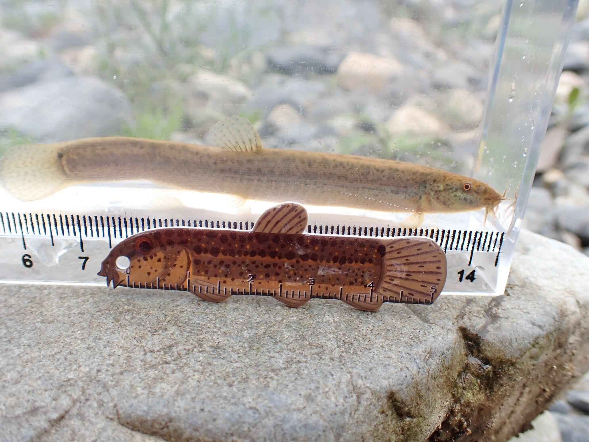 ・川で採れた魚と大きさを比べて撮影